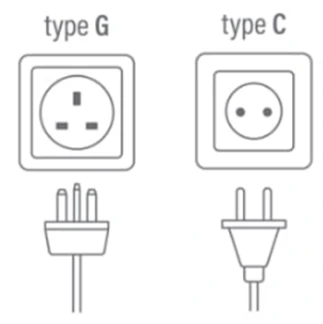 Voltage is 220 - 240 Volt AC at 50 cycles per second, adaptable to standard 3-pin square plugs and socket (Type G). 2-pin plugs and sockets (Type C) are also common.