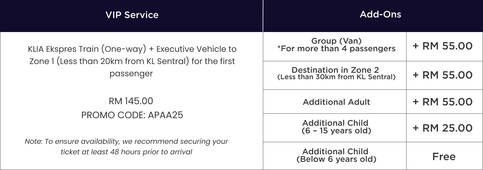 The KLIA Ekspres VIP Service offers a seamless and premium transfer from Kuala Lumpur International Airport (KLIA T1/T2) to your destination, ensuring a comfortable, hassle-free, and efficient travel experience.